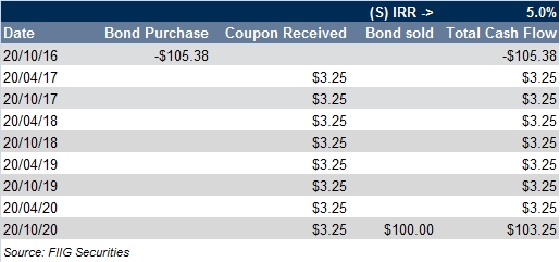 The investors in the original XYZ 6 year 6.50% fixed rate bond have been handsomely rewarded for taking both duration (1) and credit risk (2) that nets them a 9.00% p.a. return (as shown by the internal rate of return or IRR calculation below, with the bond being sold at the market value of $105.38 plus the semi-annual compounded value of the four coupon payments).