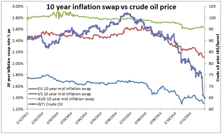 In the short term, while lower oil prices may have some impact on lowering CPI growth (lower fuel prices is one example), over a longer term horizon the market is pricing average Australian CPI at a level which is above US and EU inflation, and doesn’t see the recent falls in the crude oil price as having as significant an impact on longer-term Australian inflation. So for holders of domestic inflation linked bonds, it means that the CPI component on their inflation linked returns isn’t expected to be heavily impacted by the falling oil price. This is positive for holders of inflation linked bonds whose returns are linked to the level of inflation, with many of the inflation linked bonds being longer dated. Having said this, if oil prices were to plunge significantly, there may be broader global economic effects which could flow through to the Australian economy and CPI expectations.