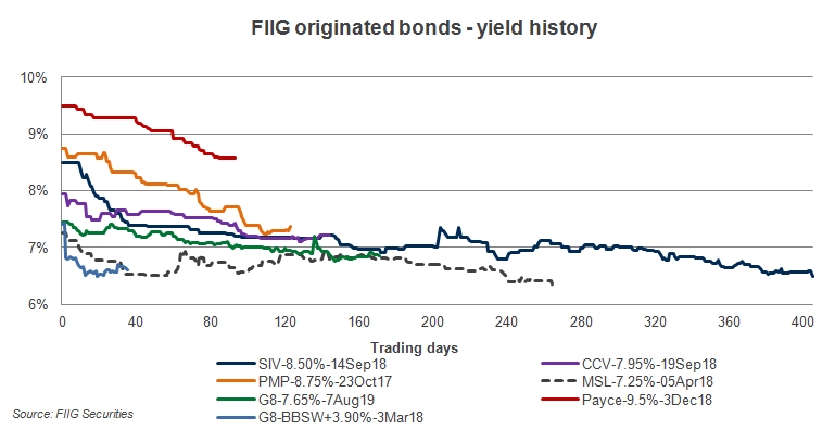 The following charts demonstrate the price, yield and spread performance of the eight previous FIIG-led deals from inception to 2 June 2014, as a function of trading days since issue.
