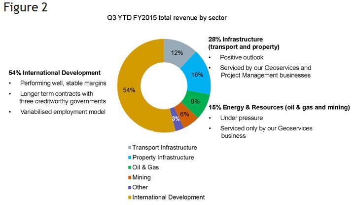 When the Coffey Notes were issued in September 2014, the company expected to be at the bottom of a business cycle. In prior years, losses were driven by collapsing mining activity and the company expected to replace this business, to some extent, in the oil and gas sector. However this sector has also come under extreme pressure too with the fall in the price of oil and Coffey is again restructuring and writing down the value of its business in these sectors. Figure 2 shows the breakdown in revenue by sector for YTD FY15.