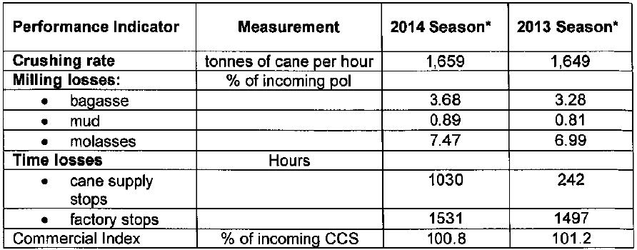 - Operational performance was poor, across the mills and in the cane supply area. There was significant increases in down time with hours lost to cane supply stops increasing from 306hrs 1H14 to 1,685hrs 1H15, and factory stops increasing from 1,998hrs to 2,995hrs in 1H15
