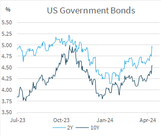 - After such a strong move higher in recent weeks, and with the US pricing now for barely one rate cut over the balance of 2024, the market has probably gone far enough in practical terms, but the momentum is still strong. Markets tend to overshoot, and I wouldn't be at all surprised if the US market does so here. But much like the strong sell-off in January saw a temporary retracement, there will be a pullback coming soon – I'm just not clear if it's going to be a day away or a fortnight away. For Australia, we have a large amount of significant data coming in the next two weeks. The May RBA decision will be made by the labour force data and the CPI print. Things could get quite volatile in the short term, but with the Australian curve now only pricing one rate cut over the next year, there's not that much more space for a sell-off unless markets are willing to price another RBA move higher. While the RBA does threaten that, the market has been exceptionally reticent to price rate hikes, and we doubt they will do so here unless the labour data is great or the CPI data is terrible. We would be actively looking to lock in yields at the higher end of ranges over the coming two weeks, particularly in Australia. The aftermath of both the labour force data (where weakness is widely anticipated and may well not occur) or the CPI data (where the downtrend is susceptible to the fact that tradable CPI can't shoulder the burden anymore) look like prime opportunities to add duration on a short-term rise in yields. The 7Y sector looks like the best place for duration.
